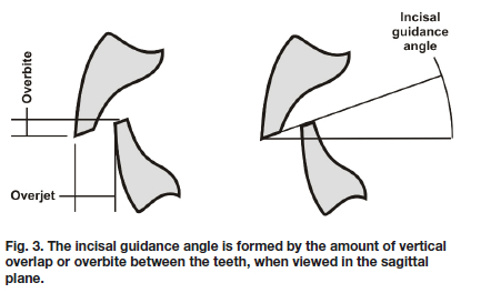 There are two determinants of mandibular movement in any forward direction, the incisal guidance angle and the sagittal condylar guidance angle. The incisal guidance angle (IGA) is formed by the vertical overlap (overbite) between the teeth (Fig. 3). It is only dependent on the amount of horizontal overlap (overjet) to the extent that there is no guidance until the teeth actually contact. In natural teeth, these dimensions of overbite and overjet are determined by the positions of the teeth; in complete dentures, they are determined by other factors, mainly aesthetics, phonetics, and function. This means they can be controlled by the dental technician and the dentist, within the limitations of the other factors that determine overall tooth position (mainly the need to achieve stability).