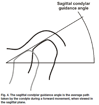 The sagittal condylar guidance angle (SCGA) (Fig. 4) is not under the control of the dentist at all, and is determined purely by the biomechanics of the joint itself. This is the net result of the condyle-disc assembly passing forwards and downwards, under the influence of the anterior slope of the glenoid fossa. As we have already discussed, the condyles do not traverse along a straight-line path as in the diagrams given here, but take a very shaky zig-zagging pathway, the net result of which can be represented by a somewhat artificial straight line as the difference between the starting and end points of the movement.