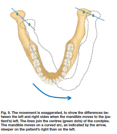 So, as it moves to the left, the left (working, chewing side) condyle hardly moves at all, and mostly seems to rotate. This makes the arc of movement of this side of the mandible shallow, influenced by the lateral wall of the left fossa (Fig. 9).