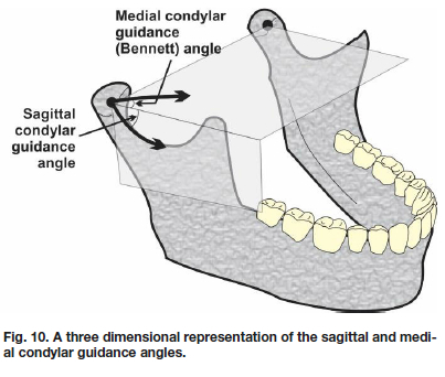 However, on the other side, the right (non-working, non chewing, balancing) side, the condyle has to move more downwards as well as sideways and is now under the influence of the medial wall of the fossa and the movement is therefore quite steep, or at least steeper than the other side. The average path taken is the medial condy-lar guidance angle, when viewed coronally, which is also referred to as the Bennett angle (after Norman Bennett who first described it in 1908 Fig. 10 shows this and the sagittal condylar guidance angle three-dimensionally.