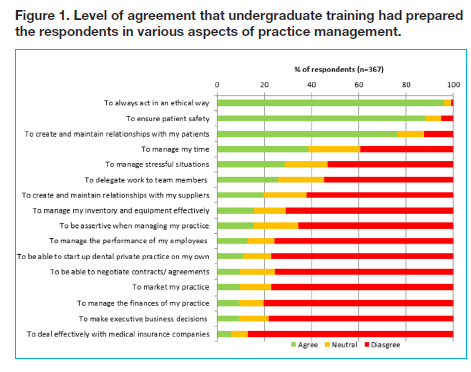 The results of this study are in agreement with those of Barber et al 2 where the largest area of concern for dentists was accounting, finance, human resources and dental insurance. A study in South Africa14 also found dentists to lack finance management skills and recommended that universities include a finance management course for undergraduate dental studies.