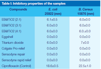 The antibacterial screening of the EB@TiO2 compounds at different ratios of eggshell and titanium dioxide modification (2:1, 3: 1, and 4:1) was determined using the disc diffusion method against E. coli and B. Cereus. The results obtained have shown that these compounds displayed a slight inhibition against E. coli and B. Cereus (Table I). It was also found that irrespective of the ratio of eggshell and titanium dioxide used, the inhibitory properties observed for EB@TiO2 were more or less the same. On the contrary, tested toothpaste (Colgate Prorelief, Sensodyne Repair, Sensodyne rapid relief), and eggshell alone didn't display any inhibition against the bacteria used.