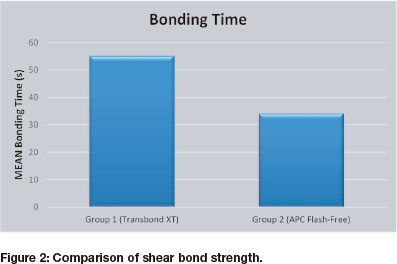 CONCLUSION: The APC Flash-Free free system is efficient and allows for reduced chair time during the bonding appointment while attaining a mean shear bond strength of 10.95MPa, which is higher than the minimum shear bond strength of between 4MPa and 7MPa1.