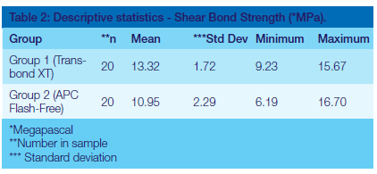 The mean SBS of the brackets in Group 1 (Transbond XT™) was 13.32 MPa (min: 9.23, max: 15.67, SD: 1.72). The mean SBS of the brackets in Group 2 (Flash-Free) was 10.95 MPa (min: 6.19 MPa, max: 16.7 MPa, SD: 2.29) (Table 2). According to the two-sample t-test, Group 1 (Transbond XT™) brackets bonded with a significantly higher shear bond strength than brackets in Group 2 (Flash-Free) (p<0.001).