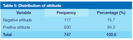 Table 5 shows the distribution of attitude and it indicates that a good number of the respondents have a positive attitude towards their oral health (84.3%).