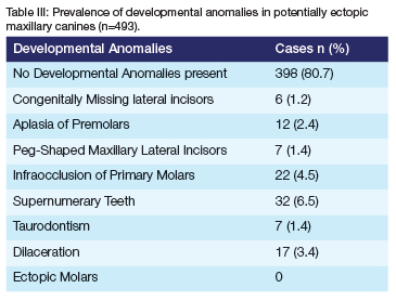 The findings of this study confirm the conclusion of Sorenson et al.4 that maxillary canine ectopia can occur in dentitions without any other dental deviations (Tables I, II and III). Other studies however suggest that the presence of one anomaly could predict another in the same case.15,33 The reciprocal associations found by Baccetti15 were not seen in this study. The low prevalence of developmental anomalies in this study (Table III) may be due to the genetic factors governing these various anomalies i.e. ethnicity/ hereditary factors.