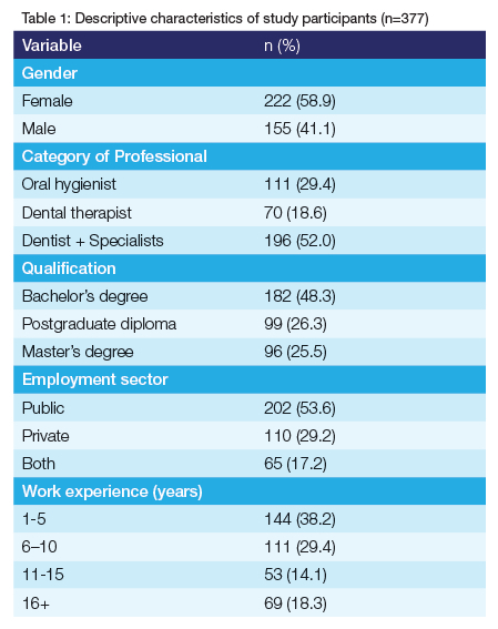 Demographic characteristics of practitioners A total of 377 oral health professionals participated in the study, giving a response rate of 94.25% which was adequate for the study. Most of the participants were female (58.9%), dentists or specialists (52.0%), public sector employees (53.6%), had a postgraduate qualification (58.4%) and had a maximum 10 years' working experience (67.6%).