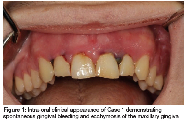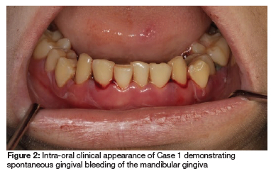 A 22-year-old male patient presented to the University of Pretoria Oral Health Centre (UPOHC), complaining of a painful lower left wisdom tooth (tooth 38), partly impacted and covered by an enlarged operculum. A private dentist had given the patient an appointment to remove the tooth under conscious sedation, but the costs were prohibitive. The attending dentist at the UPOHC noticed anterior marginal gingival bleeding of the maxilla and mandible, and wrongly diagnosed the patient with necrotising gingivitis (Figure 1 and Figure 2). Additional signs, such as purpura of the hard palate (Figure 3), mucosal pallor, skin bruising, and bilateral submandibular lymphadenopathy were noticed, which prompted a consultation by an oral medicine specialist. Further enquiry revealed that the patient recently noticed that his gums bleed easily and his skin bruises easily; he felt tired and was out of breath after walking up the stairs. He presented 2 months earlier to the emergency department of a local hospital with upper respiratory tract infection symptoms. Retrieval of the patient's blood results demonstrates that he already had a reduced red cell count, white cell count, and platelets (See Table I). The patient reported right ear deafness but was otherwise healthy, not using any chronic medication, and had no allergies.