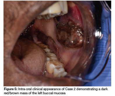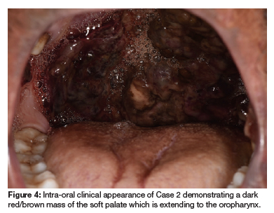 Upon clinical examination, a large dark red/brown mass was found on the soft palate, extending to the oropharynx and onto the left buccal mucosa (see Figure 4 and Figure 5). Gingival bleeding was also noted.