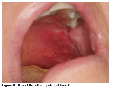 A 57-year-old woman was referred to the UPOHC by her physician to manage a persistent, painful ulcer of her left soft palate. The patient has experienced intermittent episodes of neutropenia, accompanied by oral ulcers, over the past 30 years. These are normally successfully managed with systemic and topical corticosteroids, but the current ulcer had been unresponsive and persisted for four weeks. The ulcer was surrounded by a wide bed of erythema, irregular borders and a granulating base (see Figure 6).