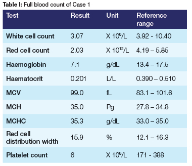 The patient's FBC seen in Table III reflects his blood values while being treated with cyclosporine. His clinical symptoms of thrombocytopenia necessitated additional supportive care with a platelet transfusion.17, 38