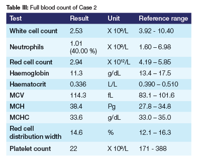The aetiopathogenesis of neutropenia can be classified according to why and when it developed. Congenital causes of neutropenia are normally associated with a decreased production or maturation of neutrophils in the bone marrow.47 These diseases are inherited in an autosomal dominant or recessive manner and include severe congenital neutropenia (Kostmann's syndrome); benign congenital neutropenia; reticular dysgenesis; cyclic neutropenia and Schwachman-Diamond syndrome.47 Cyclic neutropenia is an autosomal dominant disease, in which neutrophil elastase gene (ELA2) mutation results in intramedullary apoptosis of neutrophils.48 Our patient was never conclusively diagnosed with these conditions.