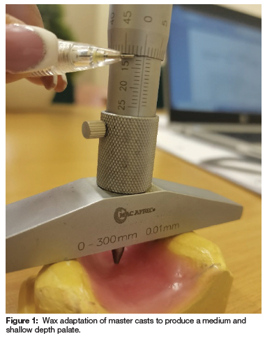 Three identical master maxillary casts were modified by adapting baseplate wax to the palatal vault depth area.6 The final casts then had one with a shallow vault depth (12 mm) the second moderate (16 mm), and the third deep (20 mm). Wax was only added to the mid-palatal areas thus the rest of the casts and ridge configuration remained unchanged (Figure 1).4,6 The casts were duplicated using silicon elastomer moulds (interduplicast A & B) to obtain three silicon elastomer moulds. Type 3 hard modelling plaster was measured to a ratio of 30 ml of water in a glass measuring cylinder and 100 g Type 3 powder using a digital scale. A vacuum mixer-twister was used to reduce bubbles, with a rotational speed of 270 rmp for 30 seconds according to methods suggested by Laughlin et al. (2001).4 The viscous mixture of Type 3 hard modelling plaster was then gently poured into the moulds and left to harden for 24 hours, to obtain 40 shallow, 40 moderate and 40 deep palatal vault casts.