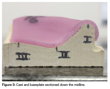 Once all the base plates had been fabricated (Figure 2), a digital Vernier calliper was used to accurately measure the linear distance between the two hamular notches (recorded as 44 mm). This was then used to determine the exact midpoint of the casts at 22 mm. A vertical reference line was then marked on the casts, extending from the Incisive papilla through the mid-palatal region to the posterior palatal seal area (Figure 3). This line served as a critical cross reference line where the cuts would be made. Cutting was then carried out using a Globe KB-36 band saw, with a blade width of 3.175 mm. This blade was used to cut both the casts and the baseplates simultaneously. Throughout the cutting process, the blade speed selector was set at a constant value of 47 blade speed units per minute. It must be noted that due to the continuous operation and friction generated by the saw blade, it produced heat during the cutting process. As a preventive measure, cutting was paused for 2 minutes between each cast to allow the blade to cool, and in addition, the blade was changed after every tenth cast to maintain the accuracy and precision of the cuts.