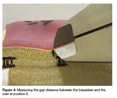 A digital Vernier calliper was used to obtain even measurement points of the left half of all casts and baseplates. The measurement of the distance from the incisive papilla (I) to the posterior palatal seal area (III) was 40 mm. Half the distance of 40 mm was measured on the same area and provided a mid-palatal area point of 20 mm (II). The digital Vernier calliper was used to measure the gap between baseplates and casts on the three predetermined points (I, II and III) for the four different baseplate materials on casts of the three palatal vault depths (Figure 4).