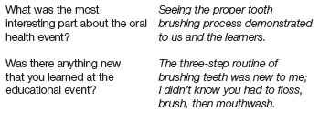 RESULTS: The emergent themes included updated oral health self-care practices, perceived improvement in knowledge and oral hygiene skills and challenges in translating perceived improvements in knowledge into practice. Participants stated that the toothbrushing process and the three-step routine of toothbrushing were the most informative aspect of the event. However, lack of resources, financing and limited available time were cited as potential barriers to implementing such events