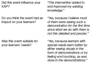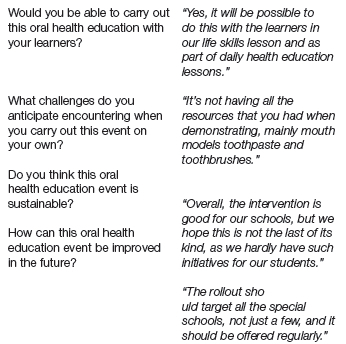 The majority of participants in the FGD stated that the oral health education and promotion event helped to improve their existing oral health knowledge. This will also assist them in independently carrying out such events with the learners in schools. They also stated that they believed the oral health event had a positive impact and was suitable for learners with special needs. This is because they believed most learners saw such detailed and precise demonstrations for the first time. The focus on visual and tactile senses during the demonstrations was seen as being more appropriate for the learners.