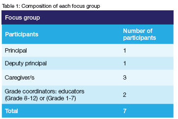 For the data collection procedure, the group discussions were conducted with the identified school groups of educators and caregivers based on their choice and availability in each group. Informed consent was obtained from all participants before the discussions commenced. The audio recordings were only done when permission was obtained from the groups and after all confidentiality issues were explained. The researcher engaged with participants by impartially presenting questions while paying close attention to participants' responses, which prompted discussion. Each FGD was approximately 30 minutes in duration and data collection occurred from August to September 2022. Field notes were made during the discussions. Data analysis