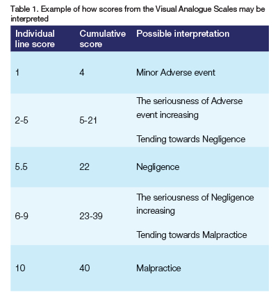 This can then be used to help justify the decision as to whether the incident should be considered an adverse event, negligence or malpractice. By default, the minimal score in any of the four categories has to be 1 and not zero, as zero would reflect that there had been no unforeseen occurrence. Thus, scores may range from 4 to 40, with 4 reflecting a minor adverse event and 40 unquestionable malpractice. The mid-point of 22 would be considered negligence. Table 1 illustrates how the individual and cumulative VAS ratings may be interpreted. Note that the baseline is 1 and not zero, resulting in 9 (36) possible scoring points. The assessor needs to consider each line independently, as well as the cumulative total, as the latter gives a more rounded, global and objective overview. It could also allow a high score in one category, which when viewed in isolation is worrying, to be cancelled out or lessened by low scores in the others.