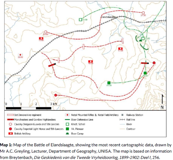 Approaching the Battle of Elandslaagte from the Manchesters' perspective allows a view of the battle from the more personal vantage point of those who took part in the fighting. Previous accounts have tended to focus on the operational aspects, such as military tactics and the strategic outcome. This article argues that reconstructing the face of battle from the viewpoint of British units during the South African War, is thus both feasible and illuminating because of the wealth of soldiers' correspondence published in the British press. However, inevitably these include a measure of self-censorship, bias and exaggeration. There are also some distortions and omissions in the correspondence. For the senior British officers and the historians, the Battle of Elandslaagte was one of the most successful three-stage set-piece battles of the war. From the vantage point of the soldiers, however, as we shall see, the experience was not always as 'neat' ... indeed it was more often confusing and suffused with a range of powerful emotions.