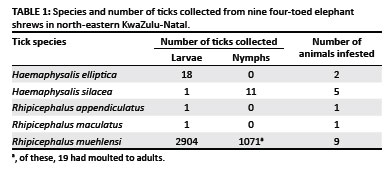 Of the 79 nyalas examined in north-eastern KwaZulu-Natal, 16 harboured all stages of development of Haemaphysalis silacea (Horak et al. 1995b). This tick has never been recorded on an elephant shrew. Its presence in this study, albeit in small numbers, on five of the nine animals examined, suggests that four-toed elephant shrews can serve as hosts of the tick's immature stages. Larvae and nymphs of the Haemaphysalis elliptica group of ticks have been collected in small numbers from rock elephant shrews (Fourie et al. 1992), and now also from four-toed elephant shrews. Their preferred hosts are, however, murid rodents (Braack et al. 1996; Fourie et al. 1992; Matthee et al. 2007).