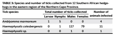 The numbers now recovered from the hedgehogs and the fact that several females were engorged indicate that these small mammals should also be considered preferred hosts of H. colesbergensis. Its presence on Southern African hedgehogs is not entirely unexpected, as hedgehogs seem to be one of the preferred hosts of ticks belonging to this genus. In fact, Haemaphysalis norvali, a species that appears to be specific to hedgehogs, has been described in Zimbabwe (Hoogstraal & Wassef 1983). To our knowledge H. norvali is not present in South Africa.