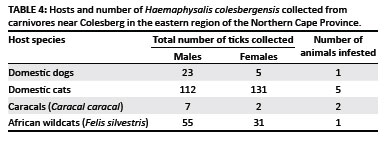 Four-toed elephant shrews are a new host record for the larvae and nymphs of R. muehlensi, a tick of which all stages of development infest nyalas in north-eastern KwaZulu-Natal. Large numbers of adult H. colesbergensis may infest Southern African hedgehogs and several species of carnivores in the eastern region of the Northern Cape Province. The hedgehogs constitute a new host record for this tick species.