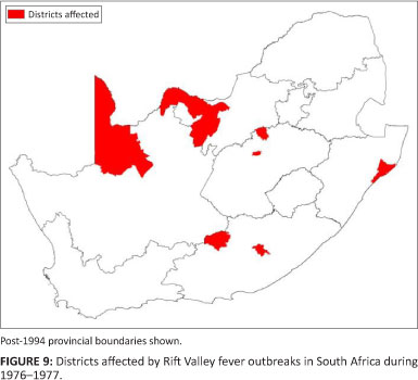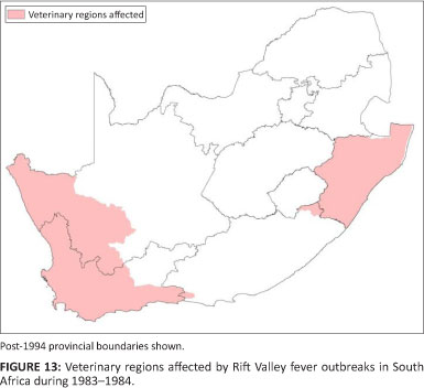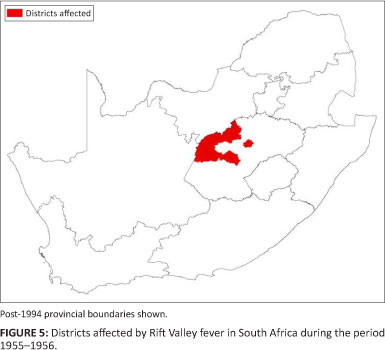 RVF was recorded in South Africa in this period in the northern Cape Province, western Orange Free State and the southern Transvaal (Figure 3). This was the first time RVF had been diagnosed in South Africa and no reports of any similar disease prior to this epidemic could be found. It started in the western Free State in December 1950 and continued until April 1951. Specific areas mentioned are the Wolwespruit and Dealesville areas of the Boshof district, Vaalhartz, the Vaal River Barrage, Loskop Dam, Koffiefontein and Standerton (Alexander 1951). At first the disease was not recognised, but after a veterinarian performing a post-mortem inspection on a farm south of Johannesburg fell ill, it was recognised as RVF (Mundel & Gear 1951) and the virus (lineage O) was isolated (Grobbelaar et al. 2011). During this epidemic sheep mortalities were estimated at 100 000, together with an estimated 500 000 abortions (Gerdes 2004). It was recognised that the epidemic was associated with the 'panveld' area of the Orange Free State, characterised by shallow grassland depressions that fill with water seasonally (Alexander 1951).
