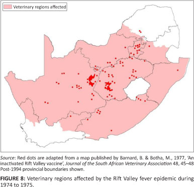 Severe livestock losses occurred owing to outbreaks reported from the Standerton, Frankfort, Kroonstad, Koppies, Odendaalsrus, Vryburg and the Lower Umfolozi districts (Figure 6) (Division of Veterinary Services 1970).
