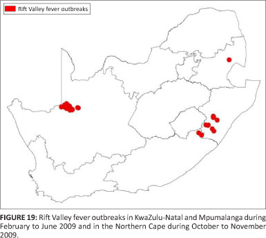 During February to June 2009 several outbreaks of RVF occurred in the Ingwe, Kwa Sani and uMngeni Local Municipalities in KwaZulu-Natal and the Matatiele Local Municipality in the Eastern Cape province, and one outbreak occurred in the Mbombela Local Municipality in Mpumalanga (Figure 19) (Directorate of Animal Health 2012). A total of 19 outbreaks were reported, with 210 animal cases and 66 animal deaths. The species affected were cattle and sheep (Directorate of Animal Health 2012). A lineage C RVF virus was isolated from several human cases (Grobbelaar et al. 2011).