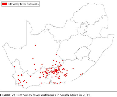 During October to November 2009 the Northern Cape province experienced RVF outbreaks associated with irrigated lands along the lower Orange River in the Kakamas region (Directorate of Animal Health 2012). A total of 19 outbreaks were reported, with 53 animal cases and 35 animal deaths. The species affected were cattle, sheep and goats (Directorate of Animal Health 2012). The NICD (2009)