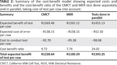 The CMCT was shown to be more beneficial than the MER test, with a total expected benefit of test per cow of R1228.64 as opposed to that of R1100.29 (Table 2). The most beneficial method for diagnosing mastitis in the mastitis-control programme was using both cow-side tests in parallel, with a total expected benefit of test per cow of R1393.25 (Table 1).
