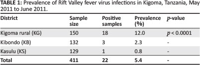 The result of this serosurvey and genome detection targeting medium-size (M) segments in domesticated small ruminants suggests that RVFV has circulated in all the three sampled districts of the Kigoma region (Figure 1). This study was conducted four years after the 2006/2007 RVFV outbreak, which was the largest RVFV outbreak documented in Tanzania (Mohamed et al. 2010). It affected 10 of the 21 regions in the country and 25 of the 126 districts. It resulted in over 300 suspected cases of RVFV and had a human case-fatality rate of 47%. This was higher than the previously reported outbreaks of 2000/2001 in Saudi Arabia (14%) and 2006/2007 in Kenya (26.4%) (Balkhy & Memish 2003; Mohamed et al. 2010).