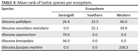 Glossina swynnertoni was captured by 90 traps, G. pallidipes by 52, G. morsitans by 10 and G. f. martinii by 8; the least trapped tsetse fly was G. brevipalpis, caught by 3 traps. Glossina pallidipes and G. swynnertoni were sympatric species recorded in 29 (24.8%) occurrences (Table 5).