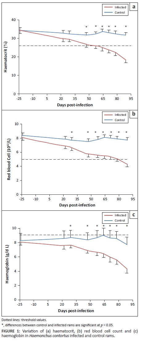 Results from this study confirmed that infection had actually occurred since H. contortus infection is known to cause significant changes of haematological parameters mainly anaemia (Al-Quaisy et al. 1987). This is reflected by the significant decrease in haemoglobin, red blood cells count and haematocrit in response to H. contortus infection. It was also established that there is a gradual decline in haemoglobin concentration during the post-infection period (Bordoloi et al. 2012), red cell losses (Dargie & Allonby 1975) and reduction of the haematocrit (Albers et al. 1990).