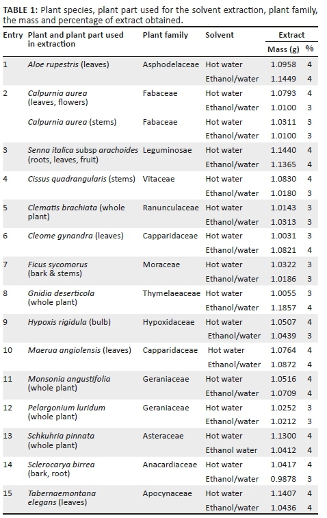 Plant material was dried in an oven at 30 °C - 60 °C and ground to fine particles using a hammer mill. Hot water and ethanol/water (30:70) extracts were prepared from the plants (Table 1). The hydroethanolic extract was prepared at room temperature by adding the solvent mixture (350 mL) to the ground plant material (30 g), which was followed by stirring for 1 hour. After stirring, the contents were allowed to settle and then the solvent was removed. The residue was re-extracted by adding the same volume of solvent and stirring for 1 h again. For the third extraction the same volume of solvent was used but this time the mixture was stirred overnight (24 h). After the third extraction, all the extracts were combined and the ethanol was evaporated using a rotary evaporator. A freeze drier or Genevac personal evaporator was used to remove water, and the extracts were then stored in a cold room at −20 °C.