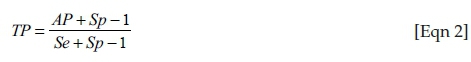 where TP = true prevalence, AP = apparent prevalence, Se = test sensitivity and Sp = test specificity (Rogan & Gladen 1978:71-76). Confidence intervals (CI) were calculated using the following formula according to Dohoo et al. (2009):