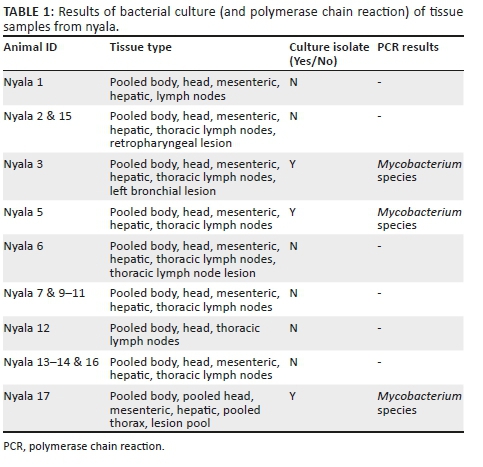 Bacterial culture of tissues from nyala 3, 5 and 17 showed growth on the Löwenstein-Jensen media after 10 weeks. The resulting bacterial colonies were all identified as non-tuberculous mycobacteria (Table 1).