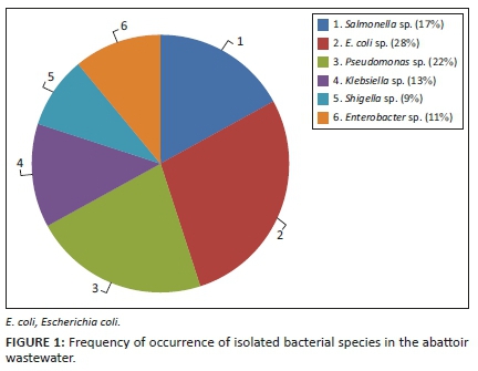 Pathogenic bacteria including Salmonella, Pseudomonas, Enterobacter, Klebsiella and Shigella were isolated from water sources used for meat processing and effluents of the abattoir. The frequency of occurrence of different types of bacterial species isolated from the abattoir wastewater is presented in Figure 1.