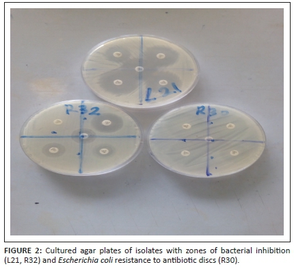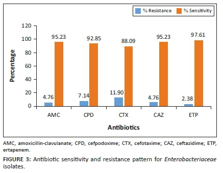 The disc diffusion technique according to Bauer et al. (1996) was conducted to determine the antibiotic susceptibility pattern of isolates. Firstly, one colony of overnight bacterial culture was inoculated into normal saline and standardised to 0.5 McFarland. Then, previously prepared sterile Mueller Hinton (MH) agar plates (BioLab, Wadeville, Germiston, South Africa) were inoculated, carefully spread over the entire surface of the agar using sterile swab and allowed for 5 min to dry. Using a sterile forceps, following antibiotic discs - cefotaxime, cefpodoxime, amoxicillin-clavulanate, ceftazidime and ertapenem were placed onto the surface of the MH agar, and incubated at 35 °C ± 2 °C for 18-24 h. The zone of inhibition was read post-incubation and recorded following the Clinical and Laboratory Standards Institute guidelines (Clinical and Laboratory Standards Institute [CLI] 2014). Isolates showing resistance to any of the third-generation cephalosporins were further investigated for extended spectrum β-lactamase (ESBL) production.