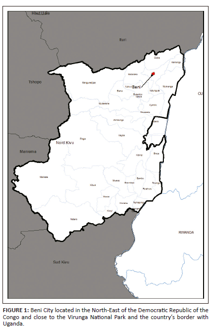 In the Democratic Republic of the Congo (DRC), data from the City of Kinshasa showed a reduction in the frequency of rabies cases between 2009 and 2011 followed by a recent increase in cases number until 2013 (Twabela et al. 2016). According to routine surveillance data reported in Kinshasa, 21 human deaths out of 3726 cases of suspicious bites were recorded between 2016 and 2021 (Office of Vaccination Against Rabies and Central Kinshasa veterinary laboratory, 2021), while 157 human deaths were recorded out of 10 498 cases of suspicious bites between 2010 and 2020 in Katanga (Vaccination Office of Lubumbashi, Haut Katanga province, 2020). Of the 143 samples taken and tested in dogs at the National Biomedical Research Institute (INRB) between 2017 and 2019, 93 were positive for rabies (PANLIRA-RDC 2021). Located in the north-east of the DRC and close to the Virunga National Park and the country's border with Uganda (Figure 1), the town of Beni records a high frequency of people being bitten by dogs and most of these victims do not access the PEP. The Provincial Bureau of Animal Production and Health reported low vaccination coverage against dog rabies (23%) in 2012. The reasons for this low rabies vaccination coverage in Beni are still unclear.