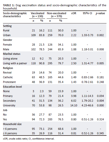 The bivariate analysis between the dog's vaccination status and the socio-demographic characteristics of the owner and household head (Table 1) shows that vaccination status is not associated with religion, nor with the size of the household, nor with the fact that the head of household has a job or not. On the other hand, the vaccinated dogs were more frequent in urban areas, in the presence of a male head of household, living with a partner, and the chance of having a vaccinated dog increases with the educational level of the owner (household head).