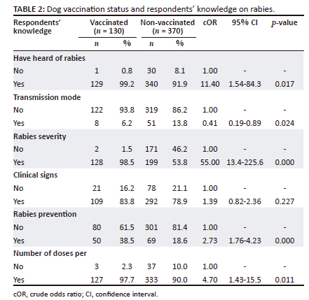 Most respondents have heard of rabies. But although knowledge is low on the transmission (12%) and prevention (24%) of rabies, the vaccinated dogs were associated with some of the respondent's knowledge on rabies (Table 2): having heard of rabies, knowledge of mode of transmission, the severity of rabies, prevention and number of vaccine doses required per year.