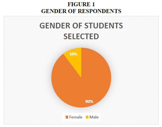 Figure 1 indicates that the majority of the respondents (90%) were female, and 10% were male.