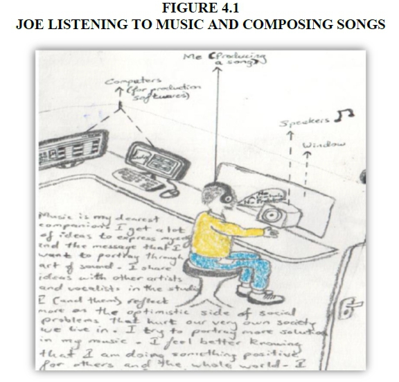 Figure 4.1 is a drawing by Joe of himself, illustrating how he would engage with music, extracting ideas and composing songs.
