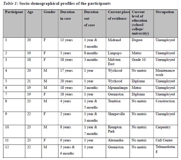 Twelve participants (six males and six females) were interviewed, of whom eight were in their mid-twenties, and four in their late teens. Six participants had spent between thirteen and twenty years in care centres, and the other six had spent between two and eight years. Of the twelve participants, two moved to Mpumalanga and Limpopo, and ten remained in Gauteng after exiting care. Regarding the level of education, one participant was completing Grade Ten and two were completing Matric during the time of the interviews. A total of six participants had not been able to reach Matric, although they expressed an interest in doing so. The remaining three participants had managed to complete their Matric and were studying at a tertiary institution. All participants had formerly been placed at the care centres within the City of Ekurhuleni Municipality. Occupationally, only five participants were employed, including in carpentry, construction, maintenance, a call centre and in telemarketing.