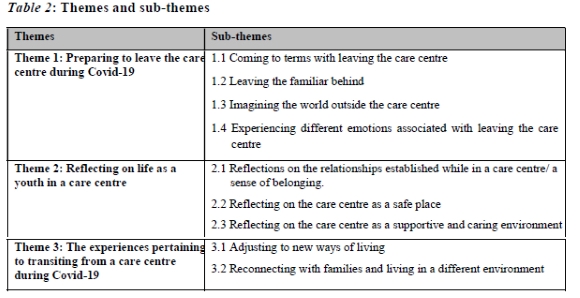 We asked participants about their experiences when they left a care centre during the Covid-19 pandemic. Their responses were analysed and clustered into themes and sub-themes as presented in Table 2.