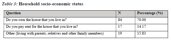 In addition to the socio-demographic data, the results also revealed the socio-economic status of the participants regarding their housing and basic household utilities. Seventy percent (70%) of the participants owned the houses (formal and informal) that they lived in, 14.17% paid rent and 15.83% lived with their parents, relatives and other family members (Table 3).