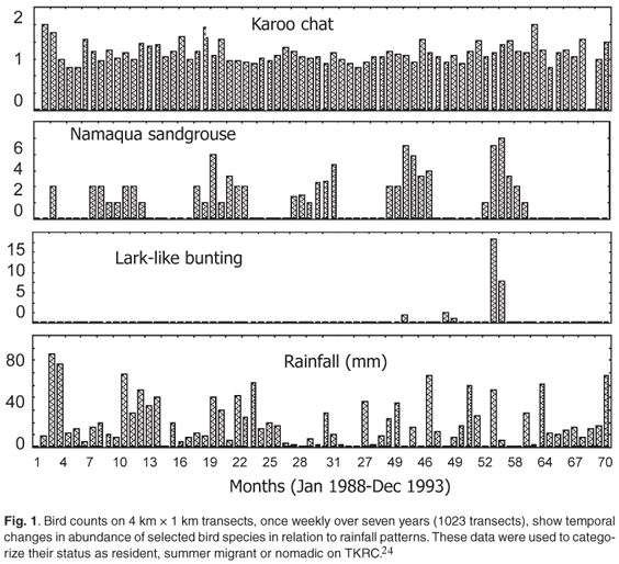 The leased status of TKRC made it possible to conduct manipulative studies such as vegetation clearing, wildlife exclosures, and food supplementation, and to erect infrastructural facilities such as buildings and a weather station. The presence of the research coordinator at the site, daily in the first two years and weekly over the next eight years, provided excellent opportunities for serendipity and detection of rare events such as insect outbreaks, hail storms, flowering and seedling emergence.22,23 Long association with the sites led to a new and well-documented understanding of plant and animal community responses to weather. For example, regular counts made it possible to categorize TKRC bird species as resident, migratory or nomadic24 (Fig. 1) and thus gain some understanding of bird community responses to land use.25,26 Collaboration of field ecologists with ecological modellers enabled empirical findings from research at TKRC to be extrapolated over longer time scales27,28 and stimulated new field research to test ideas generated by models.