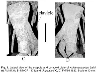 It would seem that the identification of the Field Museum specimen has been called into question at least twice in its history.4,8 For there to be a definitive answer as to the exact identification of FMNH 1532 will require a comparison of skulls, which will prove a problem, as the holotype of 'A. peavoti' is missing (K.D. Angielcyzk, pers. comm.). The postcranial skeleton of FMNH 1532 at least provides information about the species and gives at least some opportunity to determine if it is a species of Aulacephalodon. The study reported here was undertaken in order to describe the postcranial anatomy of Aulacephalodon baini and to determine if it was possible to establish a relationship between A. baini and 'A. peavoti'.